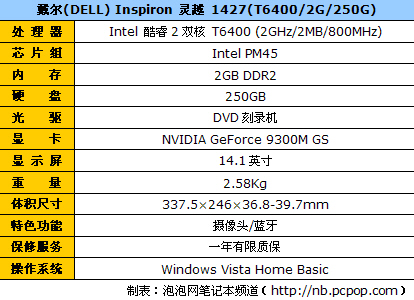 ??? 网络方面,戴尔Inspiron 1427内置10/100M以太网卡,并配备了802.11b/g无线网卡和蓝牙无线传输模块。续航方面,它利用6芯锂电池供电,官方标称续航时间可达2-3小时。