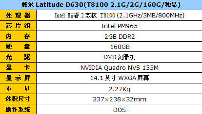 戴尔D630的机身尺寸为337×238×32.3mm,机体重量为2.27Kg。它配备了14.1英寸WXGA宽屏幕,分辨率为1280×800。