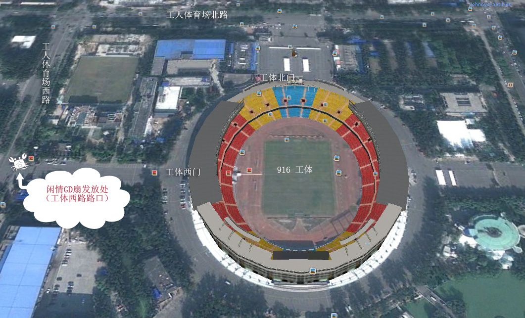 地点:工体西路路口,与工体西门人场的路的交汇点,请看上面的地图。