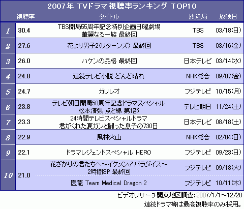 2007年ドラマ視聴率、上位10傑出揃う