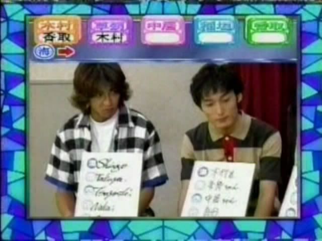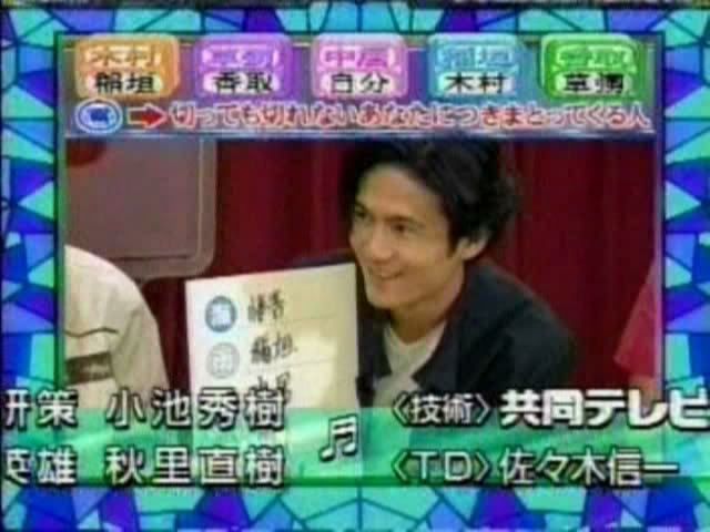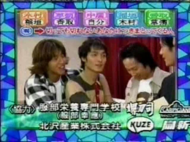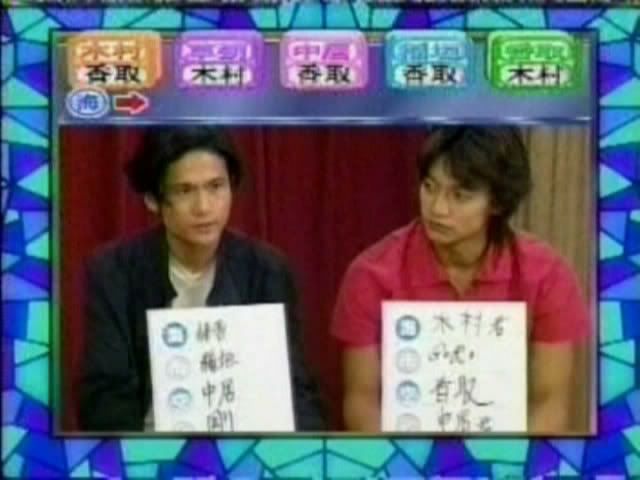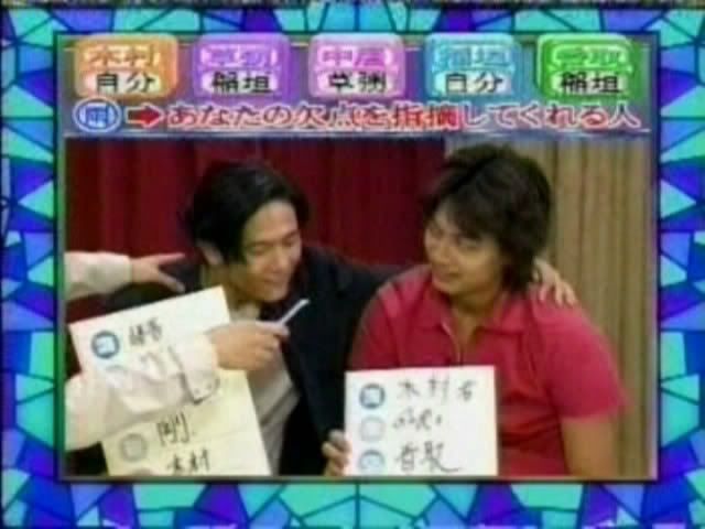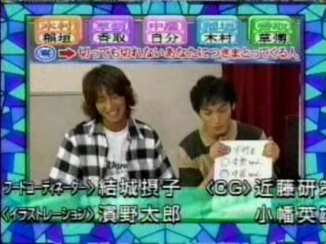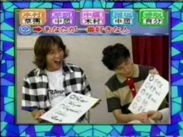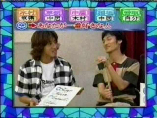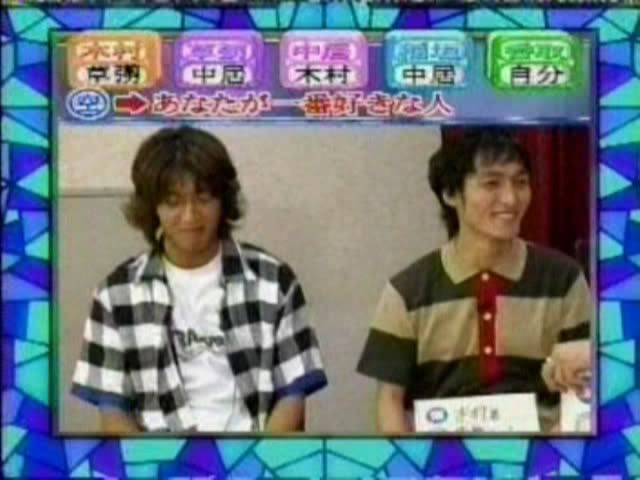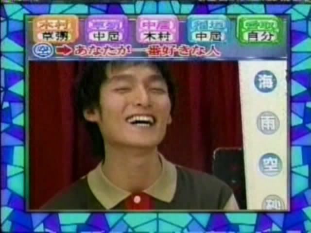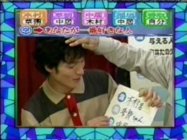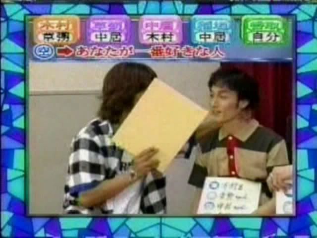 >>只记得测出来的几个结果 有一个字是代表喜欢的人 刚喜欢中居 中居喜欢木村 吾郎喜欢中居 木村喜欢刚 ....(木村和刚还用答题板遮着KISS?)慎吾的给忘了....汗死,团内5p果然不是白说的