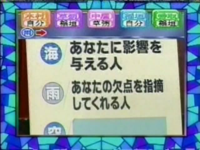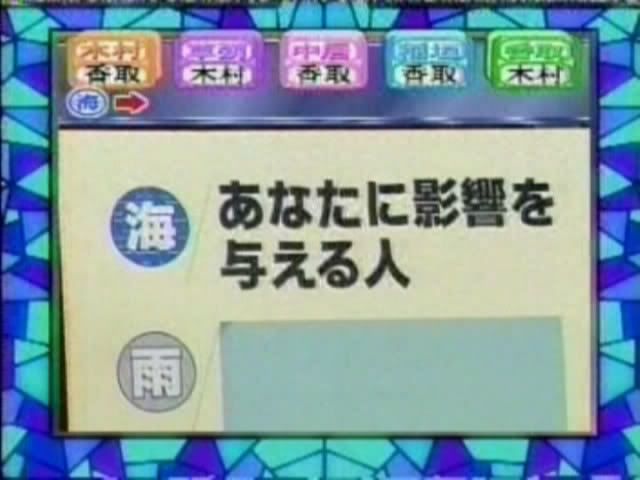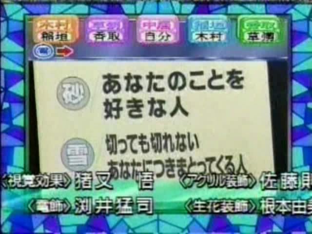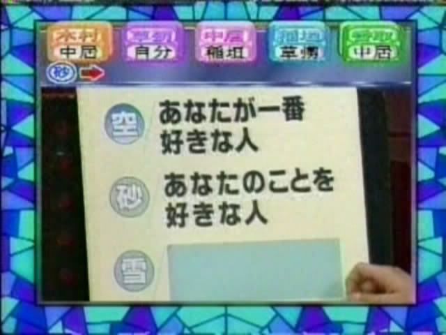 只记得测出来的几个结果 有一个字是代表喜欢的人 刚喜欢中居 中居喜欢木村 吾郎喜欢中居 木村喜欢刚 ....(木村和刚还用答题板遮着KISS?)慎吾的给忘了——————————————这个玩意也太神奇了吧~~~~
